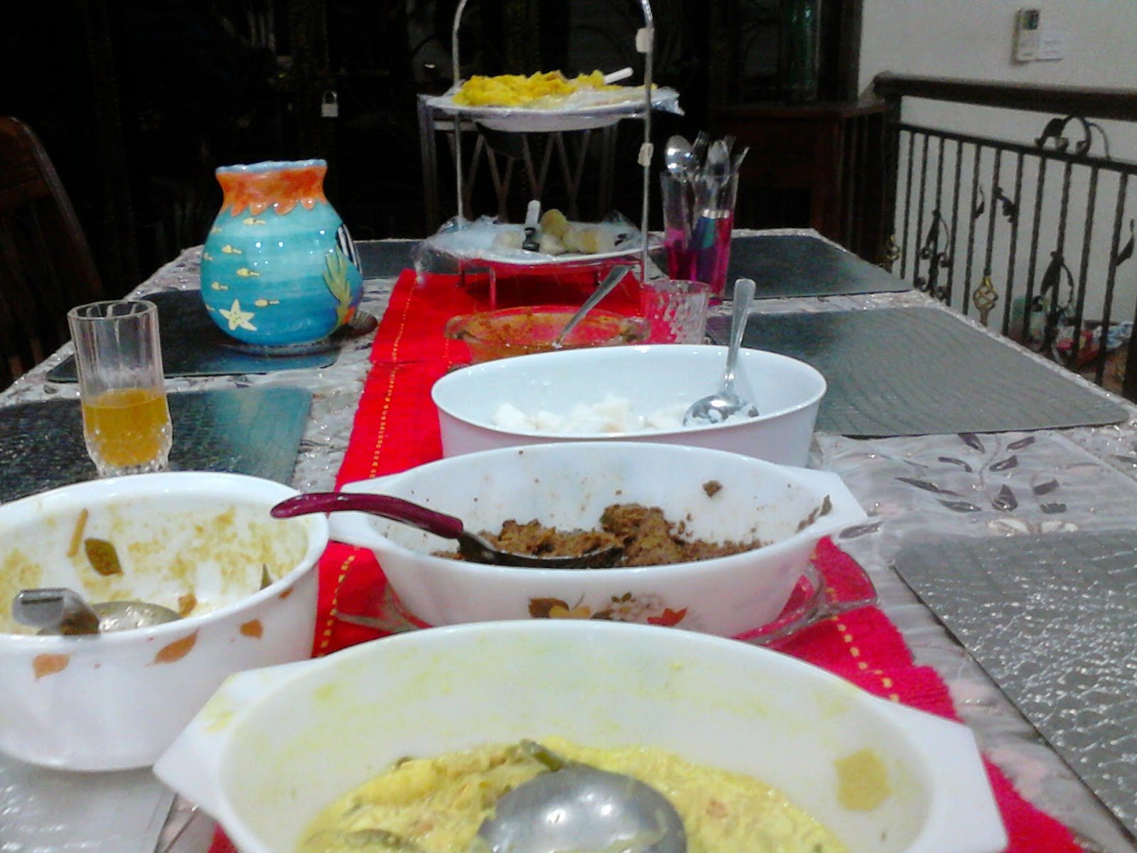 Semuanya ada tujuh jenis masakan dan satu santan. Gulai kawah, rendang, asam tumis, kurma ... lain tak ingat.