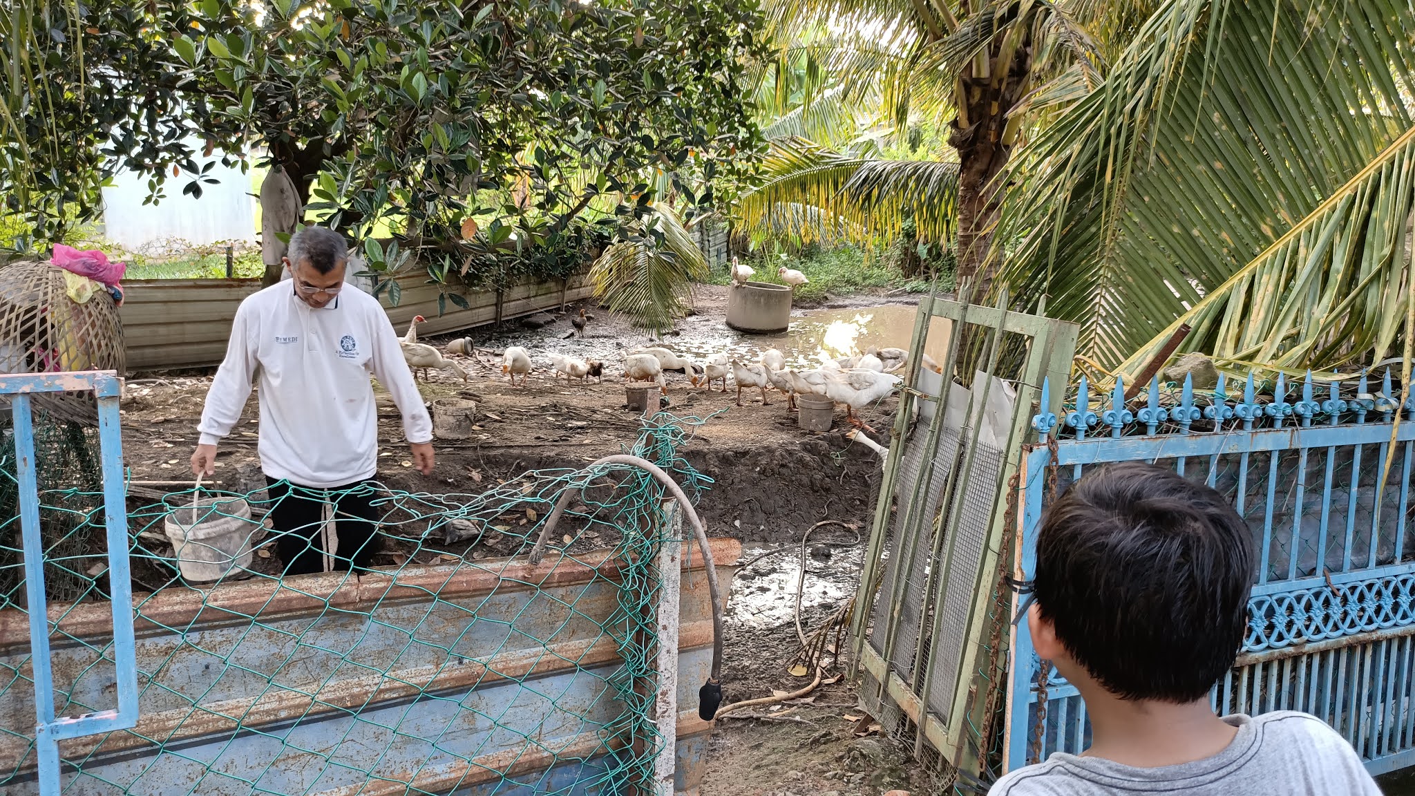 Kami bawa empat kanak-kanak ini semasa menghantar ayam - tuan rumah membawa kami melihat reban itik angsa putih sekitar 20 ekor agaknya, lapan itik serati (nampak putih semua) dan 4 ekor ayam hutan yang ditempatkan sekali. Bising bunyi angsa ni sebab lapar agaknya. Ayam kami diletakkan dalam sangkar sehari dua sebelum dilepaskan di dalam reban. Sampai rumah semua menyebut ayam dah tak ada - hem jangan ada yang rindu selepas ini. Reban ayam akan digantikan dengan burung bayan sebab sangkar agak sempit.